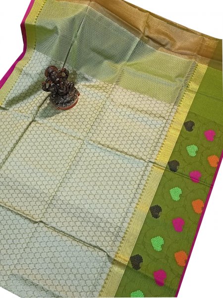 Work Details: A superior quality cotton yarn is mixed with traditional silk to produce kora  sarees. The required designs are weaved using loom using combinations of coloured cotton and silk threads and borders are added later.