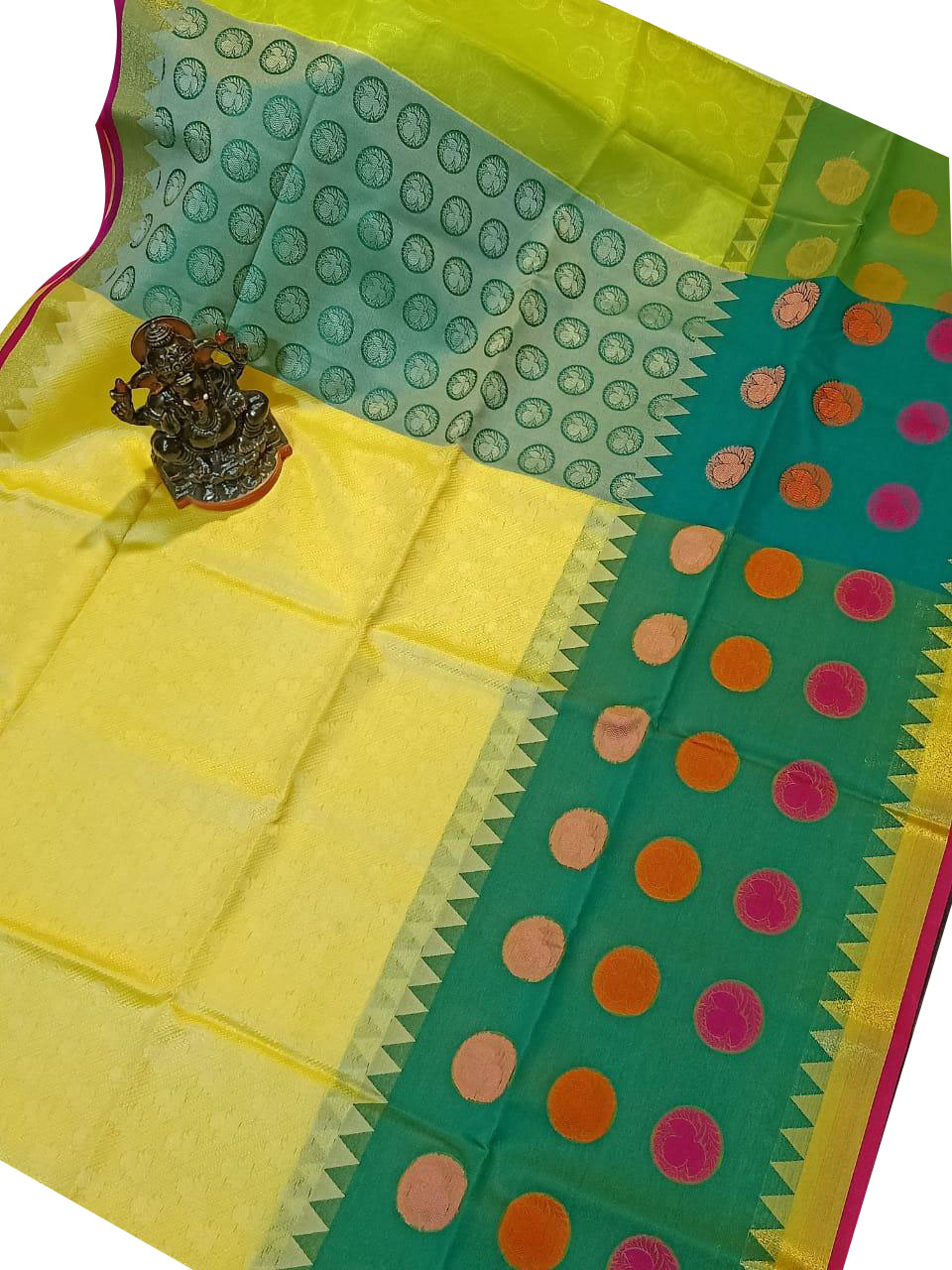 Work Details: A superior quality cotton yarn is mixed with traditional silk to produce kora  sarees. The required designs are weaved using loom using combinations of coloured cotton and silk threads and borders are added later.